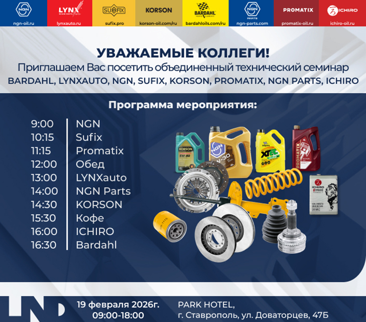 Приглашаем на технический семинар по брендам: BARDAHL, LYNXAUTO, NGN, SUFIX, KORSON, PROMATIX, NGN PARTS, ICHIRO.